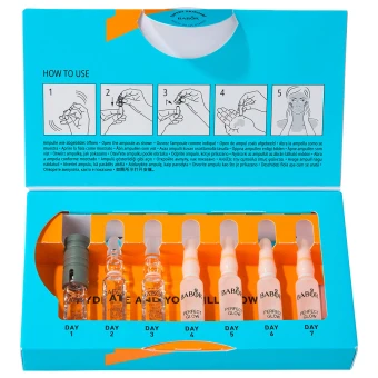 Anwendung: Nach der Reinigung Ampulle schütteln und den Ampullenhals mit einem Kosmetiktuch oder dem beiliegenden Ampullenöffner bedecken. Ampulle am Ampullenhals bzw. Öffner anfassen und mit einer ruckartigen Bewegung am unteren, weißen Ring aufbrechen. Konzentrat in den Handteller geben und dann auf Gesicht, Hals und Dekolleté verteilen. Sanft in die Haut einklopfen. Anschließend Pflegecreme auftragen.