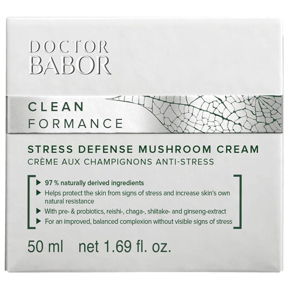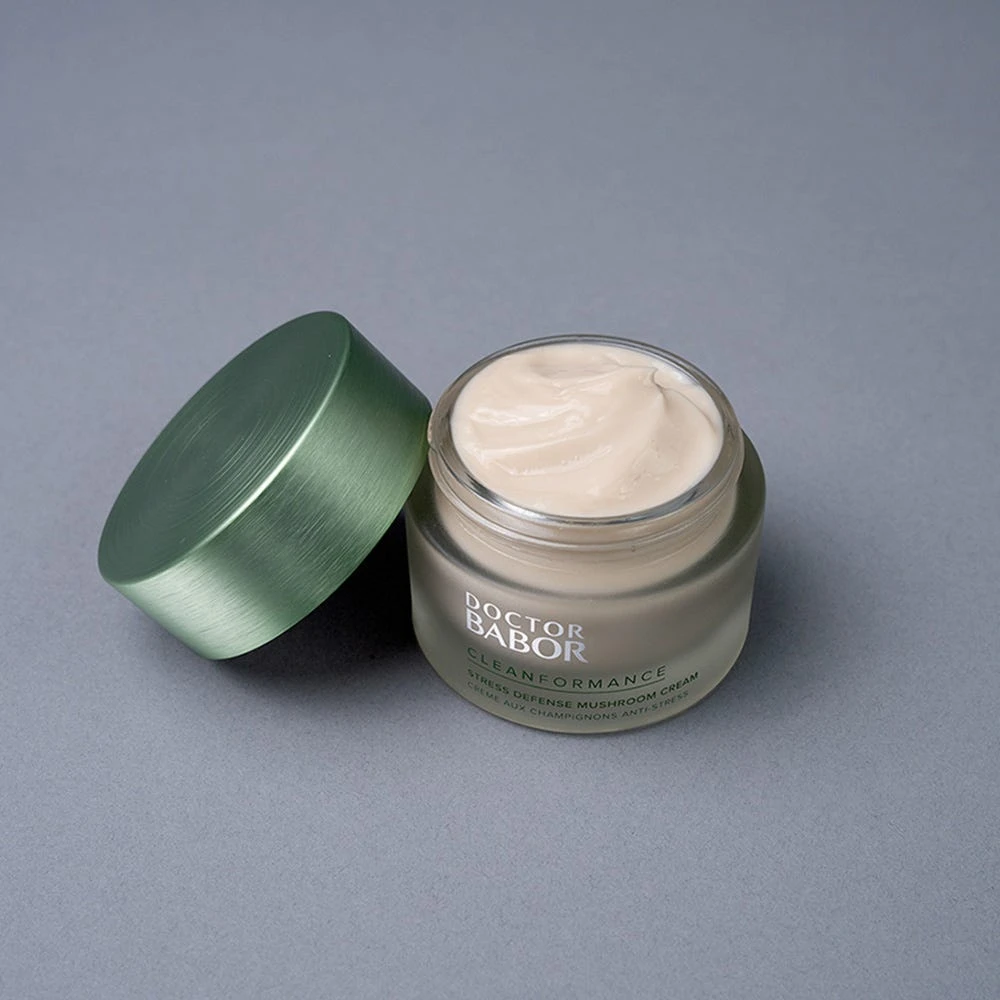 Die BABOR Doctor Babor Stress Defense Mushroom Cream hilft dank eines 7% antioxidativen Wirkkomplexes die natürliche Widerstandskraft der Haut gegen negative Umwelteinflüsse zu erhöhen. Inspiriert von der Traditionellen Chinesischen Medizin hilft die Kombination aus Reishi-, Shiitake-, Chaga- und Ginsengextrakt die Haut vor Stresserscheinungen zu schützen, hält sie im Gleichgewicht, unterstützt die Reduktion von Mimikfalten und verleiht der Haut neue Vitalität. Der Teint wirkt sichtbar ausgeglichen und belebt, ohne Anzeichen von Stress.